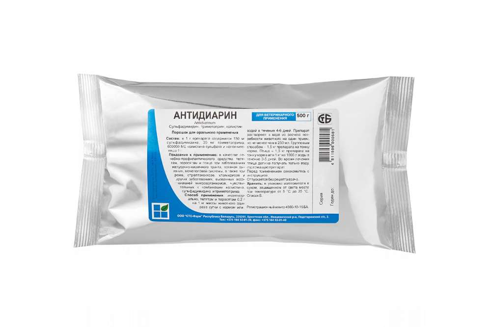 Антидиарин - комплексный антибактериальный препарат на основе колистина и комбинации сульфадимидина и триметоприма. Активнодействующие вещества проявляют синергизм, усиливая действия друг друга и расширяя спектр антимикробной активности препарата.